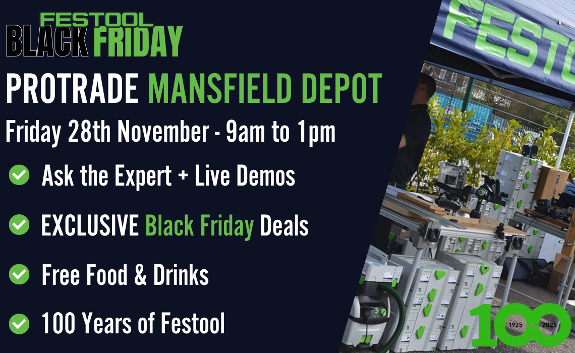 Festool Friday returns to our Mansfield Depot this November, this time with a Black Friday Special. You can grab extra savings across the entire Festool range, view live demos on some of Festool’s newest range. Plus take part in on the day competitions, and don’t miss the all important FREE food & drinks.