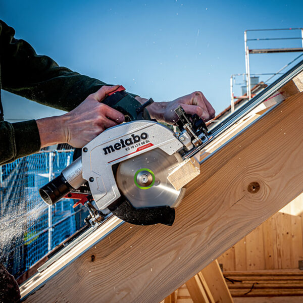 The Metabo KS 18 LTX 57 BL 18V 165mm Circular Saw is a powerful, light, cordless circular saw for universal use on construction sites. The aluminium base plate can be directly used on guide rails from Metabo and Mafell, Bosch, Festool, Makita, HiKOKI, Hilti and other manufacturers.