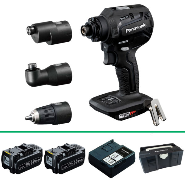 Included as Standard: 1 x Panasonic EY1DD2 18V Drill/Driver, 13mm Keyless Chuck Attachment, Right-angle Attachment, Eccentric Attachment, 2 x 18V 5.0Ah Batteries, Charger and Systainer Case.